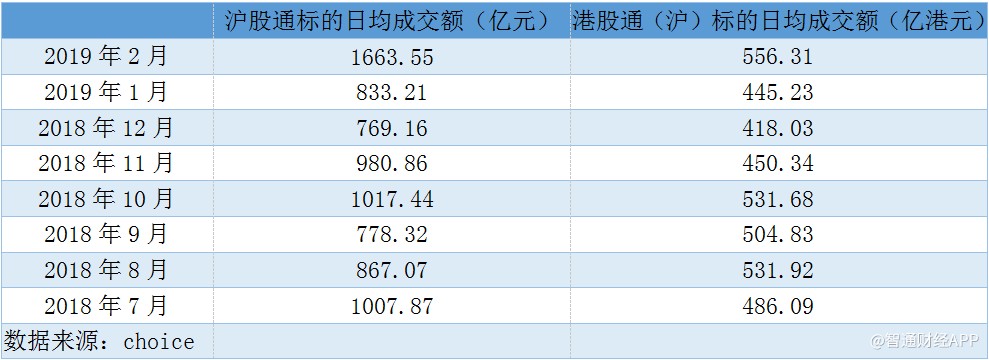 伴随着股市上涨的,是两地资本互通的热度。据智通财经APP统计,北上资金方面,2019年2月,沪(深)股通标的日均成交额分别为1663.55亿、1997.6亿;南下资金方面,沪(深)港股通日均成交额分别为556.31亿、598.36亿,均相较于其他月份显著放大。