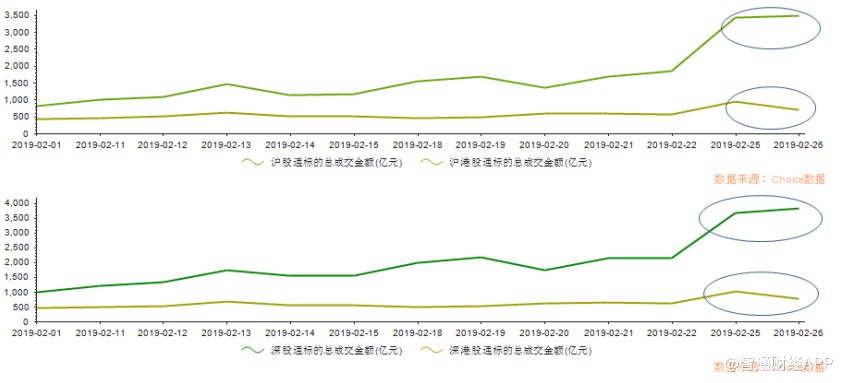 随着两地逐渐趋于技术牛市的形态,2月的沪(深)股通、沪(深)港股通标的总成交金额折线一路向上,近两日骤然上扬。