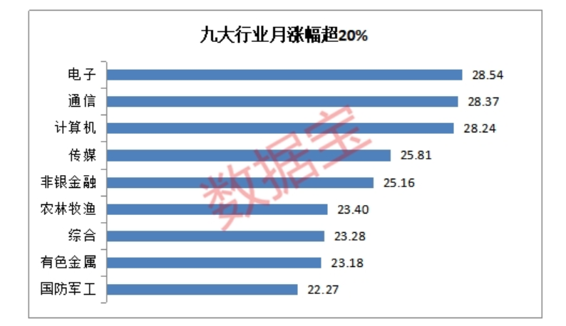 28个申万一级行业中,有9个行业二月份的涨幅超过20%,电子、通信、计算机、传媒、非银金融行业涨幅超过25%,位列前五。28个行业的月平均涨幅为18.4%,行业普涨现象明显。