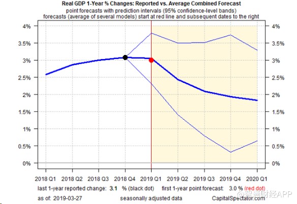 每季度更新的GDP同比数据趋势也表明,美国经济出现下滑。《资本观察家》通过一系列综合预测得出的平均预测值显示,今年第一季度的同比增幅将从去年第四季度的3.1%小幅降至3.0%,并在未来几个季度继续走软。如果预测无误,这一同比增幅将出现自2016年第二季度以来的首次下降。
