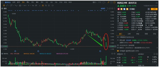 4月15日,晨鸣纸业发布业绩预告称,公司2019年一季度盈利仅在3000万-4500万元人民币(单位下同)之间,同比下降94.25%-96.17%,公司股价大跌,恐慌性卖盘出现。