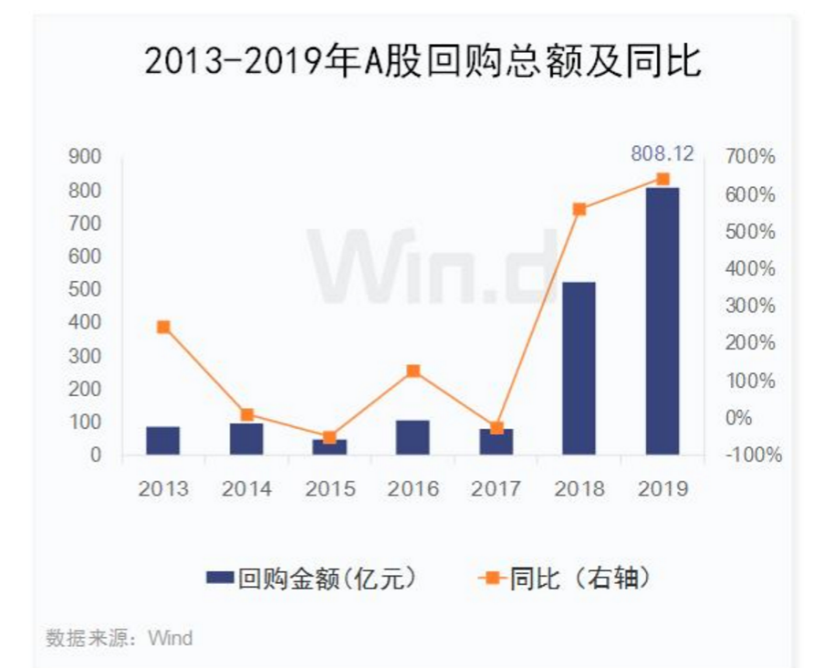 2019年初至今,两市已有711家公司实施了回购计划,总回购金额远超去年全年,达808.12亿元,同比增长6.43倍,2018年同期回购总规模为108.76亿元。