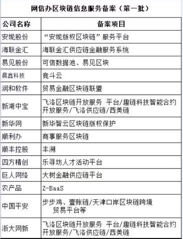 第一批区块链信息服务备案于3月30日发布:A股公司涉及安妮股份、海联金汇、易见股份、晨鑫科技、润和软件、新湖中宝、新华网、顺利办、顺丰控股、四方精创、巨人网络、农产品、中国平安、浙大网新。