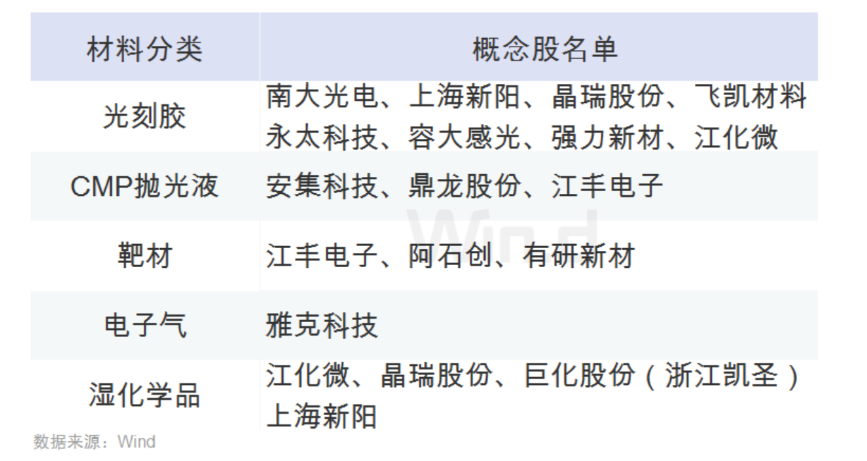 关注光刻胶:光刻是整个集成电路制造过程中耗时最长、难度最大的工艺,耗时占IC制造50%左右,成本约占IC生产成本的1/3。从需求端来看,光刻胶可分为半导体光刻胶、面板光刻胶和PCB光刻胶。其中,半导体光刻胶的技术壁垒最高。目前全球光刻胶市场基本被日本和美国企业所垄断。国内生产的光刻胶中,PCB光刻胶占比94%,LCD光刻胶和半导体光刻胶占比分别仅有3%和2%。国内PCB光刻胶国产替代进度快,面板光刻胶和半导体光刻胶与国外相比仍有较大差距。