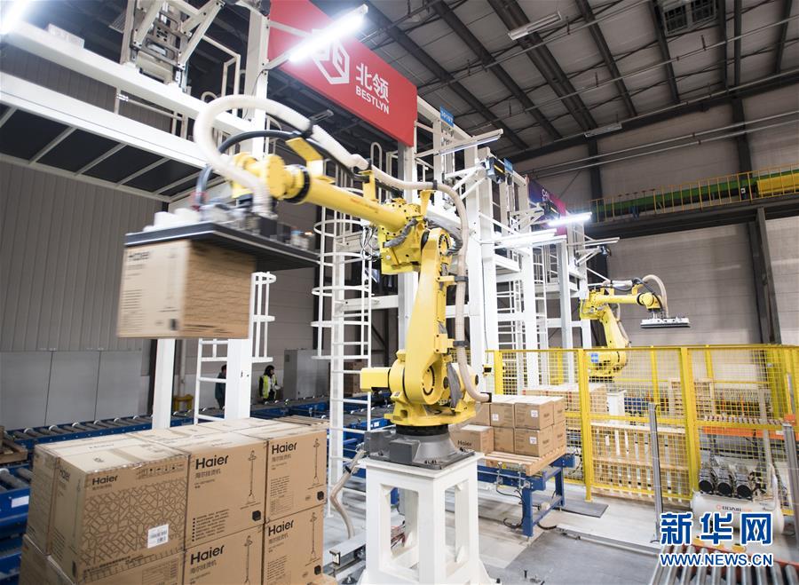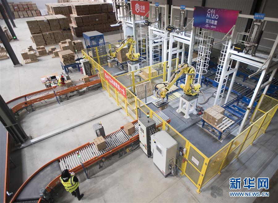 近日,在菜鸟网络武汉黄陂物流仓内,一组机械臂在进行搬运作业。近日,菜鸟网络在湖北武汉黄陂物流仓库启用智能机械臂来搬运商品。据介绍,每组机械臂一个小时能搬运1000件商品,可以24小时不间断作业。这些机械臂的投入,有助于缓解高峰期货物处理压力,提高发货速度,被工程师亲切地称为“麒麟臂”。新华社记者肖艺九摄