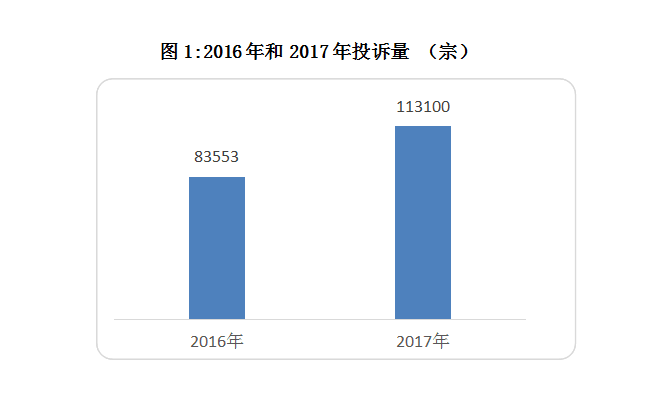 2017年,深圳市、区消委会共接受消费者投诉113100宗,比2016年的83553宗增长了35.36%。“315消费通”系统来源投诉65065宗占比58%,12315电话来源投诉45888宗占比41%,可见“315消费通”系统已经成为消费者投诉主要方式。