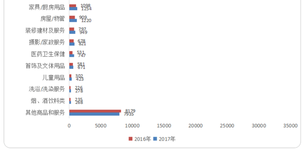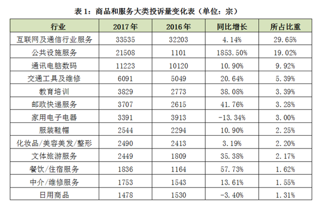 2017年,商品和服务二十五大类投诉中,互联网及通信行业服务、公共设施服务、通讯电脑数码投诉量居前三位,均超过1万宗,分别占投诉总量的29.65%、19.02%和9.92%。