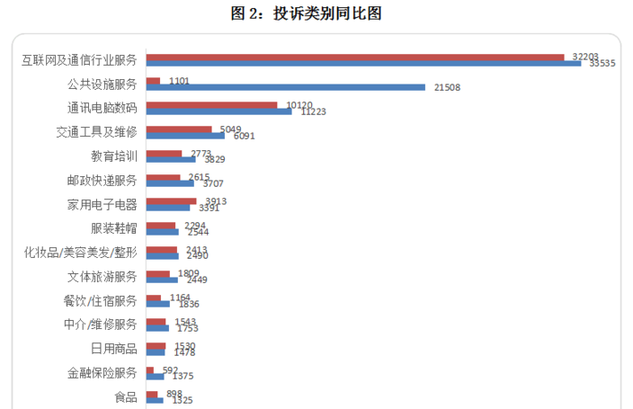 互联网及通信行业服务投诉33535宗,投诉量继续位居第一位,但增长幅度有所缩小,同比仅增长4.14%。