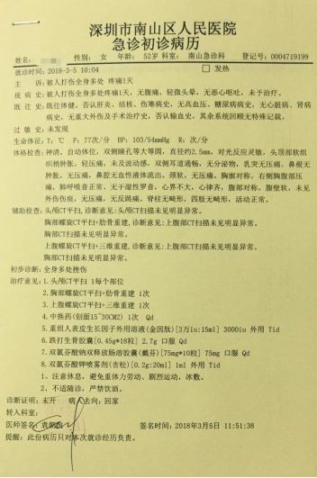 第二天,张女士立刻去深圳市南山区人民医院急诊科就诊,初步诊断为“全身多处挫伤”。罗小姐说,“当时的法医鉴定结果是轻微伤,法医鉴定贴好封条交给了派出所。”
