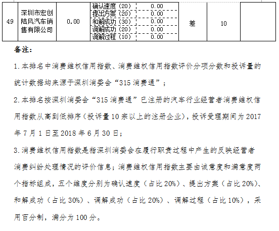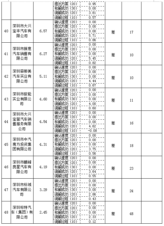 在细分指标方面,深圳市标域汽车有限公司、深圳标特汽车(集团)有限公司和深圳市宏创陆风汽车销售有限公司等27家企业处理投诉不及时,未积极与消费者先行和解,导致其企业“确认速度”、“提出方案”和“和解成功”三项分项指标的分数皆为0,严重影响了企业的消费维权信用指数和信用等级。深圳市仁孚特力汽车服务有限公司、深圳市安进汽车贸易有限公司和深圳市大兴宝誉汽车销售服务有限公司在由消委会工作人员评分的“调解过程”分项指标分数为负分,3家企业存在不配合调解甚至拒绝调解的情况,解决消费纠纷的诚意度较差;另外,深圳市宏创陆风汽车销售有限公司的消费维权信用指数为0,诚意度和满意度为0,10宗消费投诉皆未处理成功,排名最后。