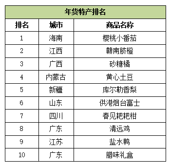 9.礼盒去哪儿:不少在北上广深的消费者将年货礼盒寄回了老家,以下10个城市收到的远方问候最多:济南/沈阳/青岛/成都/重庆/天津/西安/长沙/郑州/武汉。