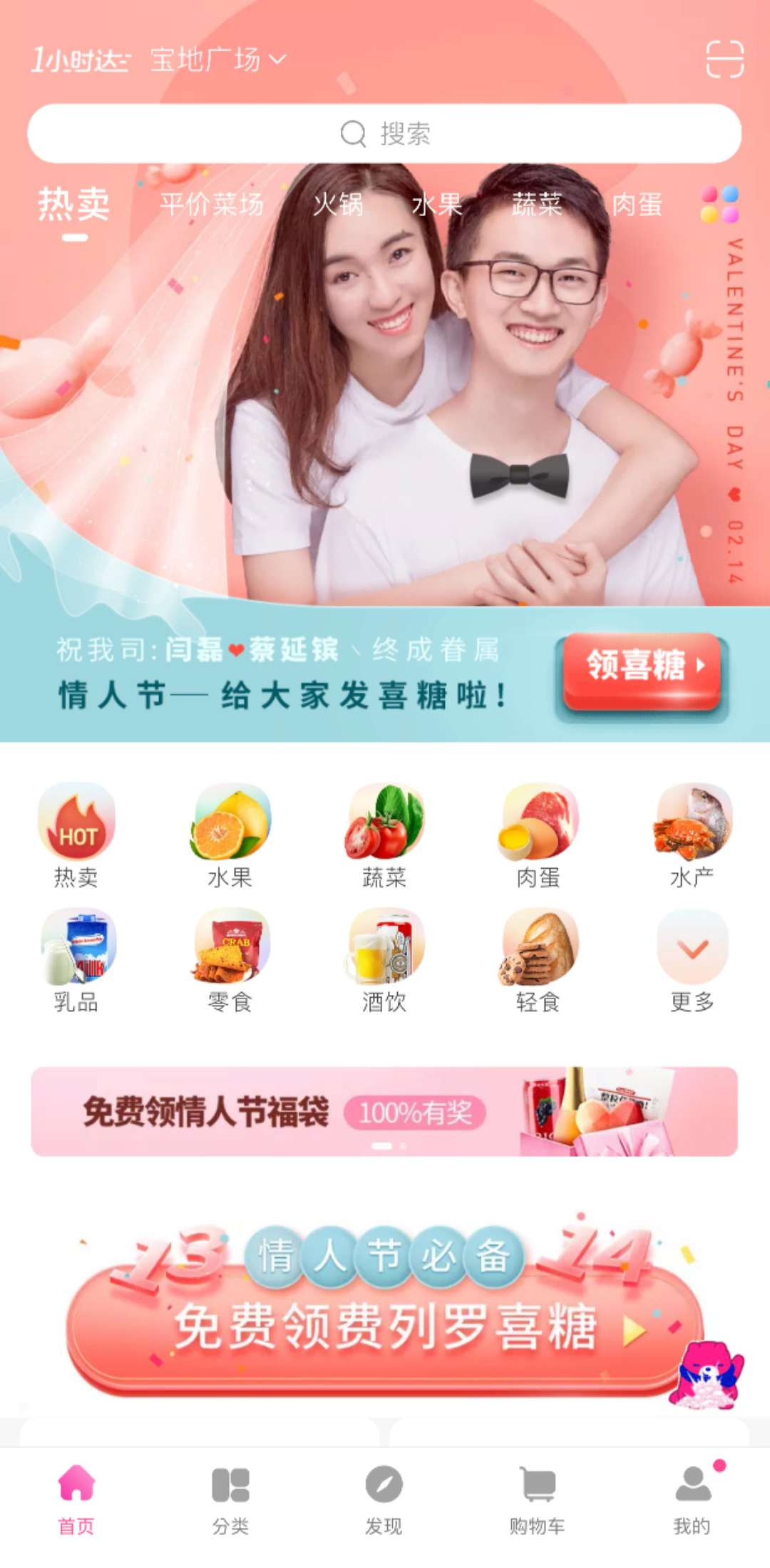 2月13-14日,广州、深圳地区每日优鲜用户登录每日优鲜APP首页,便看到两位新人的甜蜜的结婚照,让大家非常意外。