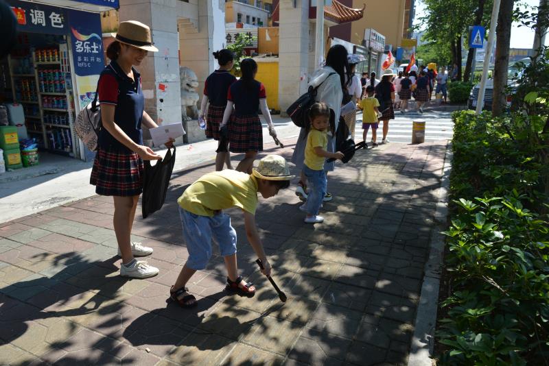 上午9点多,慈善小天使和志愿者们,从横岗华明星幼儿园开始,沿着华西村和志健广场等横岗片区,一路清捡道路垃圾和与路人合影宣导,向过往市民分发“垃圾不落地”资料,宣传环保知识。特别支持的市民,小天使们派发了棒棒糖这一他们最好的感谢礼物。