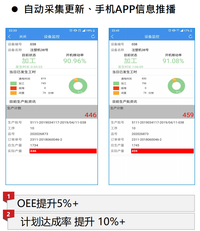 智能换模工业APP,侦测换模时机,缩减时效与提升质量。寻模备模调机时间缩减约80%(原30分钟,现约5分钟);裁线工站设备稼动率提升20%(单台每日产能提升40分钟,每日毛利约增加1.6万)。