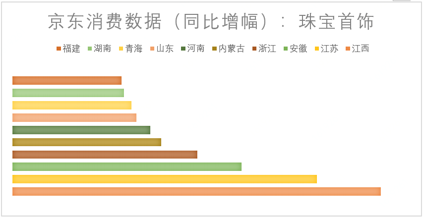而在珠宝首饰的需求上,东南省份再次成为消费主力军,其中江西省的同比增幅达到300%以上,看来在江西的小伙伴今年国庆期间可没少参加婚礼。