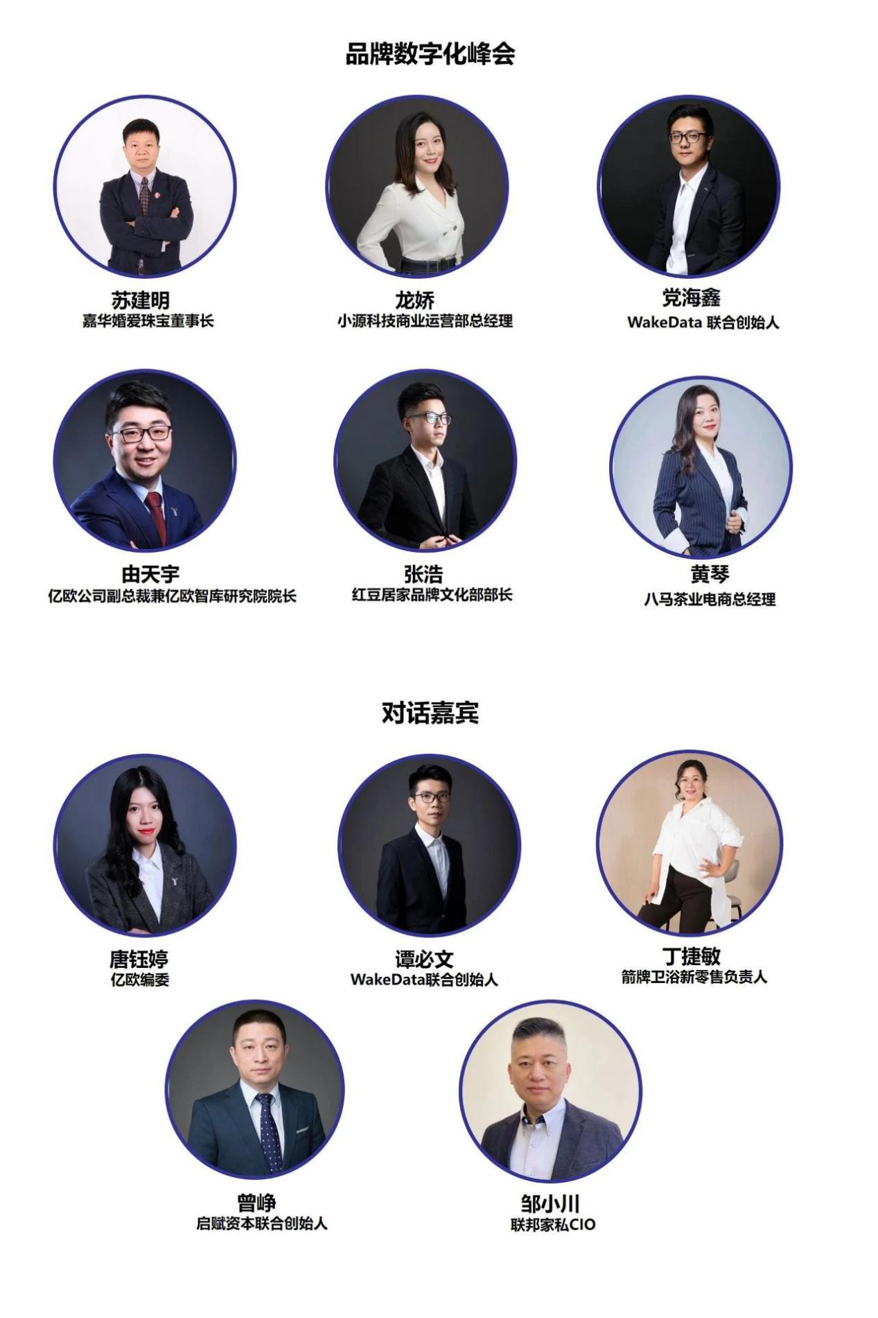 10月30日14:00—17:00(宴会厅Ⅱ)举行品牌数字化峰会,由嘉华婚爱珠宝董事长苏建明主持。小源科技商业运营部总经理龙娇演讲主题《企业AI场景化服务之道》 WakeData联合创始人党海鑫演讲主题《唤醒数据让企业更懂自己的用户》,亿欧公司副总裁兼亿欧智库研究院院长由天宇演讲主题《品牌的技术创新与潮流变革》,红豆居家品牌文化部部长张浩演讲主题《基于用户的品牌数字化升级》,八马茶业电商总经理黄琴演讲主题待定。圆桌对话由亿欧编委唐钰婷主持,对话嘉宾包括WakeData联合创始人谭必文,启赋资本联合创始人曾 峥,箭牌卫浴新零售负责人丁捷敏,联邦家私CIO邹小川。