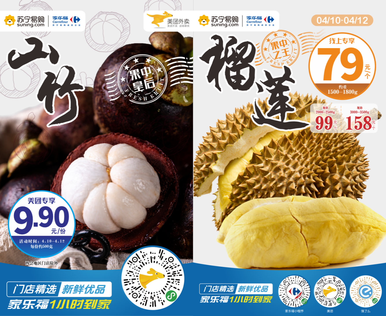 此外,周末还有另外两款生鲜爆品必须安利给小伙伴!4月10日至12日,9.9元/份的山竹搭配79元/个的榴莲,华南市民再也不怕大补上火了呢!特别注意的是,优惠仅供家乐福线上专享,“码”上安排!(吴艳 通讯员蔡民婷)