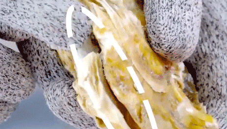 开生蚝特简单,趁其不备,找到生蚝边缘,插它一刀,往边上一拧,它就不“自闭”了!