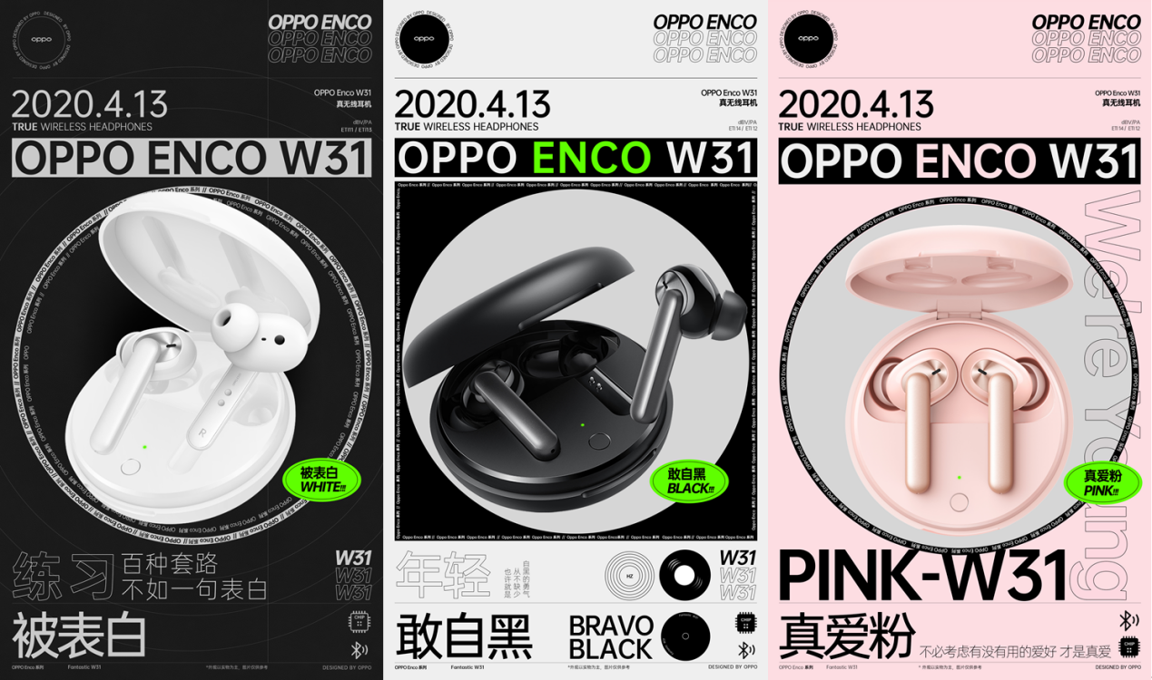 OPPO Enco W31真无线耳机将极简设计美学与前沿科技完美糅合,化身潮流好物。遵循简约小巧的设计理念,外壳圆润轻巧,方便用户随身携带。拥有敢自黑、被表白、真爱粉三种配色可供选择,满足年轻人不同个性的表达。
