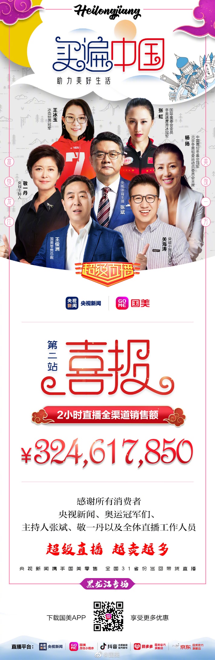 见圳客户端·深圳新闻网2020年8月4日讯 群星闪耀,再创佳绩!7月31日晚20点,“买遍中国·助力美好生活”全国31省份巡回带货直播黑龙江专场以3.25亿的销售额收官。出生于黑龙江的中央电视台著名主持人敬一丹与黑龙江籍冬奥冠军杨扬、张虹、王冰玉共同组成“龙江四美”,与央视体育频道主持人张斌一起,展现了黑龙江历史文化、乡土风情,介绍了生态农业发展,也推荐了诸多美食与好物,并为北京冬奥会助力加油!