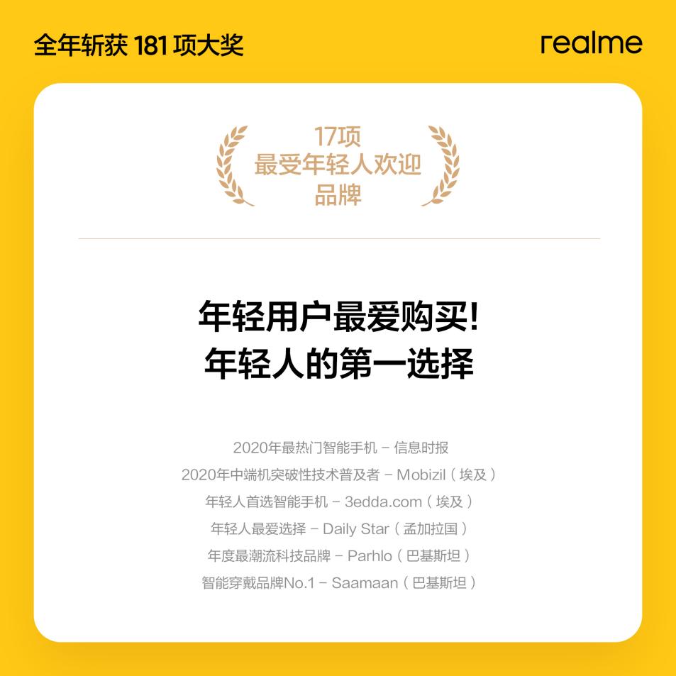 自创立以来,realme一直面向年轻用户群体,基于对年轻人审美与偏好的精准洞察与理解,不断满足和超越年轻科技爱好者的需求,这一策略在东南亚、南亚、欧洲、非洲等市场获得极大认可。2020年,全球给予realme“年轻人最喜爱品牌”等相关奖项达17项,用实力证明realme是“年轻人第一选择”。同时,realme一举网罗全球各大产品奖项,充分证实了“好产品会说话,产品才是硬实力”这句被商界奉为圭臬的卓见。