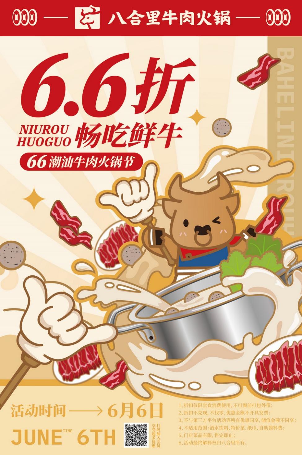 记者获悉,近日为了回馈食客的喜爱与青睐,实力“宠”粉的八合里动作频频,重磅打造粉丝首届66潮汕牛肉火锅节——6月6日当天,只要到店消费,加入八合里会员并使用美团、大众点评买单,即可6.6折享受一顿鲜牛火锅大餐!值得一提的是,以真真切切的实惠让利消费者的同时,八合里还携全新的LOGO形象、品牌IP“小八”惊艳亮相,宣布品牌进入焕新阶段,传递年轻的态度文化与品牌初心,为消费者带来满满的诚意和惊喜。