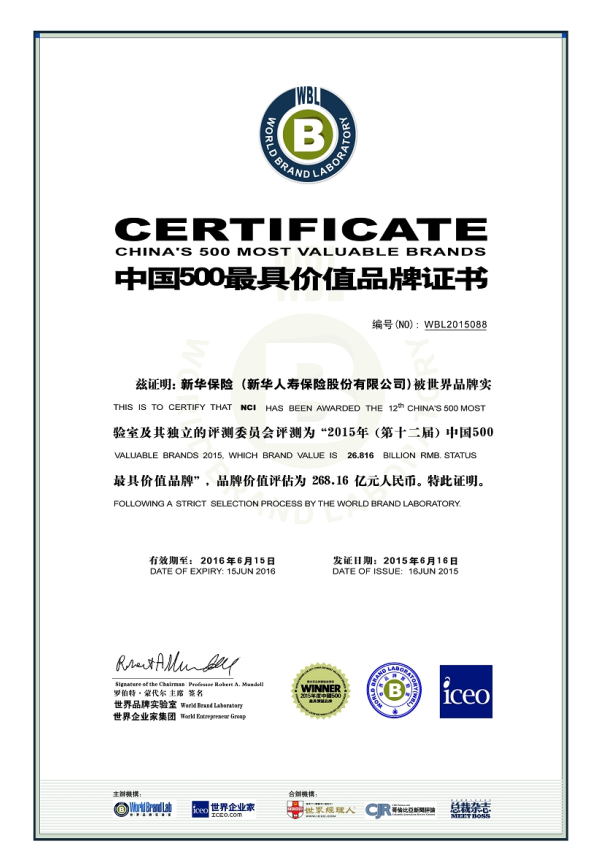 世界品牌实验室(World Brand Lab)发布2015年(第十二届)《中国500最具价值品牌》排行榜。新华保险品牌价值为268.16亿元,同比提升逾40亿元;位居榜单第88名,比去年晋升3位,连续三年稳居中国前100强。