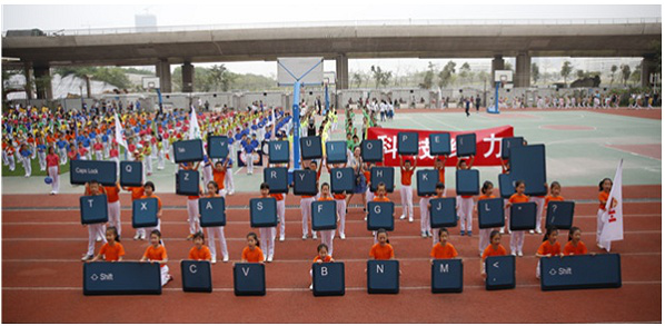 随着激昂的《运动员进行曲》奏响,每个班级方阵队排列整齐蓄势待发。瞧,一群可爱的小机器人向我们走来,跳着欢快的机器人舞蹈,高呼着他们口号。这些漂亮逼真的机器人服,可是孩子和爸爸妈妈们使用废旧纸箱自己彩绘装饰出来的。随着神舟十一号返回舱顺利着陆,这群矫健的小小宇航员们,踏着豪迈的步伐向我们走来。咦,我们电脑室的键盘怎么也飞奔到了现场,他们飞快的舞动着按键,向奥林匹克传递着:“我运动,我自豪。”的讯息。