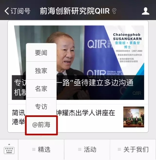 在“前海创新研究院QIIR”的底部菜单栏里找到“@前海”,就可进入以下页面,从研究院放眼前海,获得一手新鲜资讯。