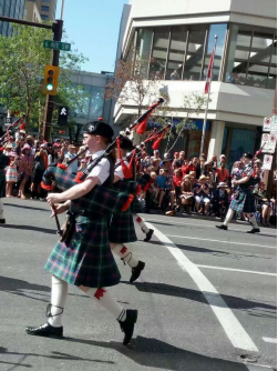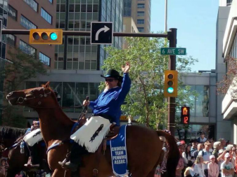 7月7日天一亮,我就赶去卡尔加里参加牛仔节(Calgary Stampede)大游行,来自全世界各地穿着各式各样盛装的人们早就有序地就地而坐,集聚在卡尔加里市中心的第六大道和第九大道的两旁,等候着游行队伍。