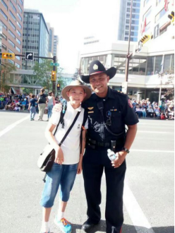 警察叔叔还风趣地告诉我说:“在游行队伍中有来自世界各地的代表队,游行大道两旁观看的人们也是来自全世界各地的人们,大家都非常守秩序,有礼貌,我们警察也只负责和大家一起Ya-hoo就行了!”采访后他都对我竖起了大拇指,还与我合影留念。