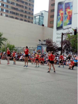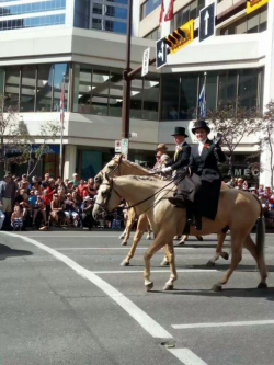 随后几个人穿着盛装走过来,人们都翘首望着游行大道的远处,在我正有点失望的时候,乐鼓声有远而近渐渐向我们这边走来,人们的欢呼声Ya-hoo也越来越大了,大游行正式开始了。走在最前面的是一支浩大的军乐队,跟随在军乐队后的有150支游行队伍,有高大的马车、民簇乐队、舞蹈队、花车、皇家骑警、原住民、牛仔公主、王子、历届牛仔竞技男女冠军、还有我们中国的太极等150对支游行队伍,由市中心的第六道和第九道长达五公里近二小时的游行!