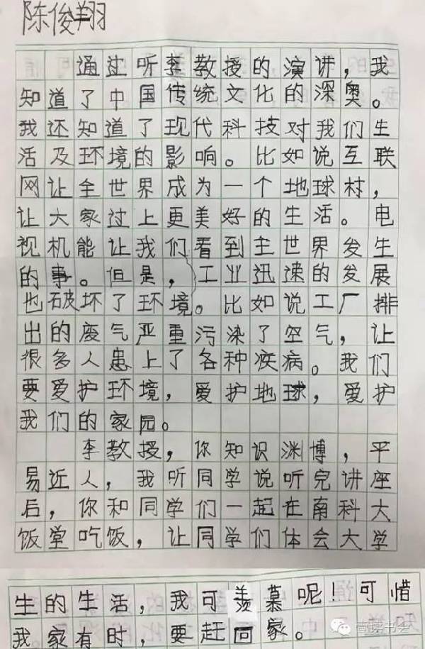 近日,多位小朋友特地就这次讲座表达感想。他们纷纷盛赞讲座深刻,令其受益匪浅,“深受感动”。他们纷纷在感想里提到李教授平易近人,讲课精彩,更在听完李教授的课后开始反思现代科技与当代生活,提升自身思想和文化水平。