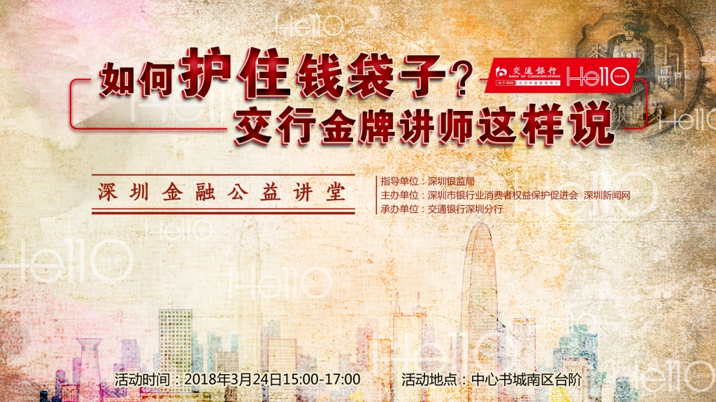 在深圳银监局指导下,由深圳新闻网和深圳市银行业消费者权益保护促进会共同主办,交通银行深圳分行承办的2018年“深圳金融公益讲座”系列活动将在3月24日14:30,于中心书城南区大台阶拉开帷幕。