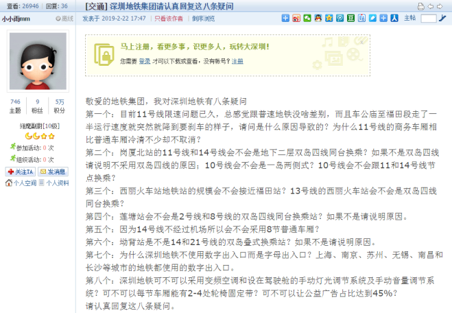2月22日,有市民在深圳论坛发帖《敬爱的地铁集团,我对深圳地铁有八条疑问》,对深圳地铁提出一系列专业且详细的问题:“11号线限速问题由来已久”“11号线商务车厢比普通车厢冷清不少却不取消”,对新建地铁线路的换乘方式、14号线采用普通车厢还是商务车厢、西丽站的规模等建设方案提出疑问,并质疑地铁站出入口使用字母标识而不是数字标识是否合理。帖文中也提出了“采用变频空调”“手动灯光调节系统及手动音量调节系统”“每节车厢能有2-4处轮椅固定带”等建议,并希望“车站内公益广告占比要达到45%”。