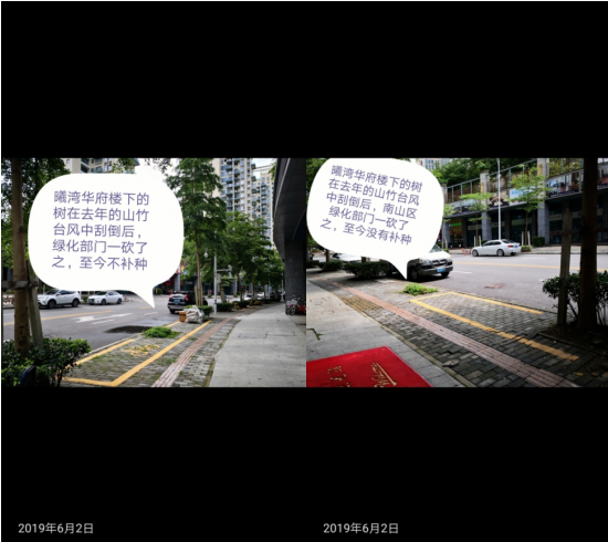 “南山区城管局当时回应道:‘因台风砍倒的树木将会统一采购,尽快予以补种;有问题的路牌将于七月底前更换。会尽快联系南山税务部门,修复有问题的井盖’”,该市民却对管理部门的工作效率提出质疑:“然而现在距离投诉已经两个月了,问题依然存在。工作效率如此之低?”