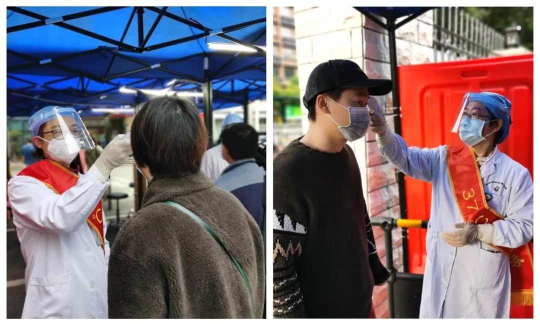 一名党员志愿者正在为进入医院大楼的市民测体温。“36.5度,一切正常,请您继续做好疫情防护,切不能掉以轻心。”