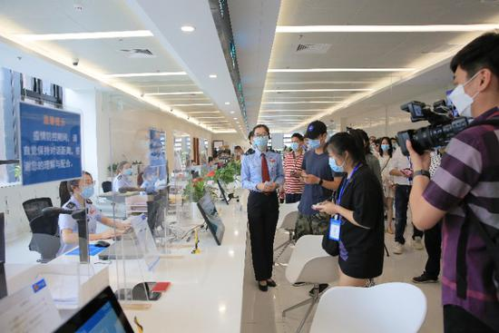 搭载全流程智能系统的办税大厅让办税更高效便捷。图为深圳市龙华区税务局工作人员为参加走进办税厅活动的代表委员和媒体记者展现智能化建设成果。