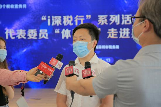在代表委员“体验官”走进大厅的活动中,全国人大代表杨飞飞亲身体验深圳市税务系统智能化建设。图为杨飞飞代表接受现场采访。