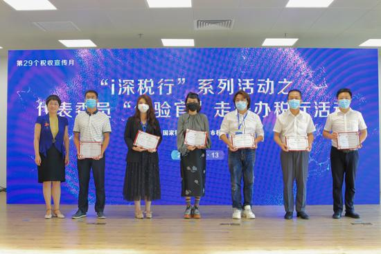 在“i深税行”系列活动之代表委员“体验官”走进办税厅活动中,深圳市税务局总经济师项清(左一)为出席活动的代表委员授予“优化税收营商环境体验官”称号。