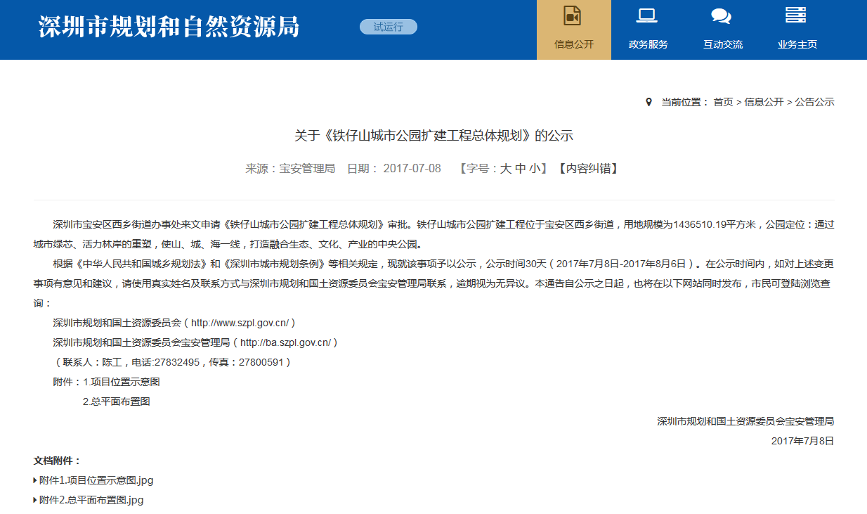 早在2017年,当时的市规土委曾经在官方网站发布了《关于<铁仔山城市公园扩建工程总体规划>的公示》:深圳市宝安区西乡街道办事处来文申请《铁仔山城市公园扩建工程总体规划》审批。铁仔山城市公园扩建工程位于宝安区西乡街道,用地规模为1436510.19平方米,公园定位:通过城市绿芯、活力林岸的重塑,使山、城、海一线,打造融合生态、文化、产业的中央公园。