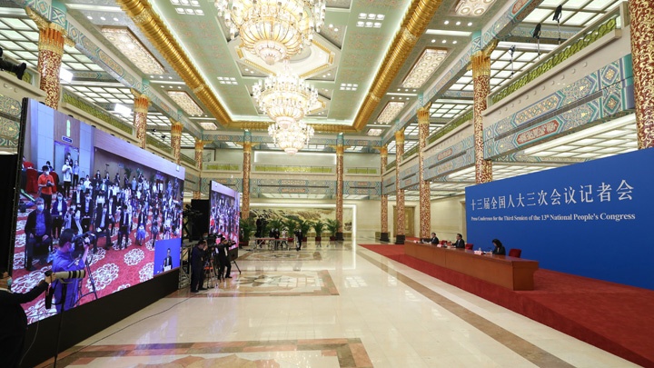 2020年5月28日(星期四)下午十三届全国人大三次会议闭幕后,国务院总理李克强在人民大会堂三楼金色大厅出席记者会并回答中外记者提问。为有效防控疫情,共同维护公共卫生与健康,记者会采用网络视频形式进行。新华网、中国政府网进行现场直播。 [2020-05-2814:00 ]