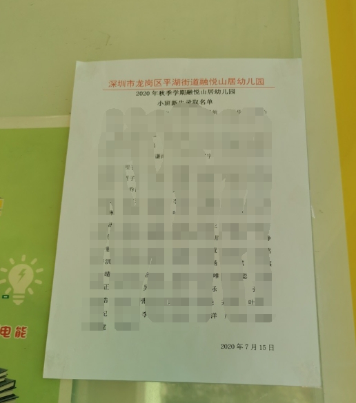 龙岗区平湖街道融悦山居幼儿园2020年秋季小班录取名单(市民供图)
