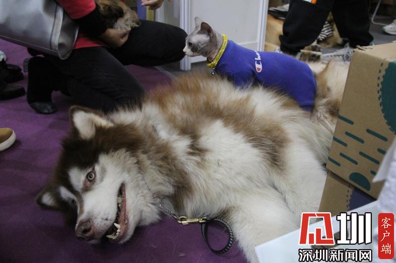 展商的无毛猫正坐在一只阿拉斯加犬身上四处张望。