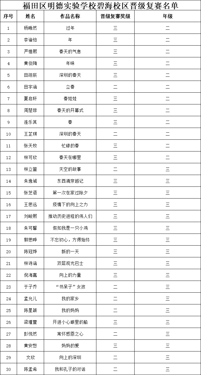 自2021年1月,活动征稿启动以来,获得了深圳市广大中小学生、教师、文学爱好者的热烈响应积极参与,吸引了深圳百余所学校的上万人关注报名。现公布福田区明德实验学校碧海校区专场晋级复赛名单如下:
