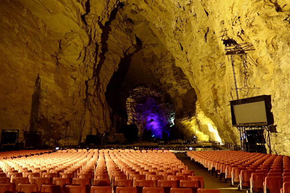 旱洞里现在有两个剧场,有定时的激光和歌舞表演。水洞里有地下瀑布10余处。李仁奇 摄