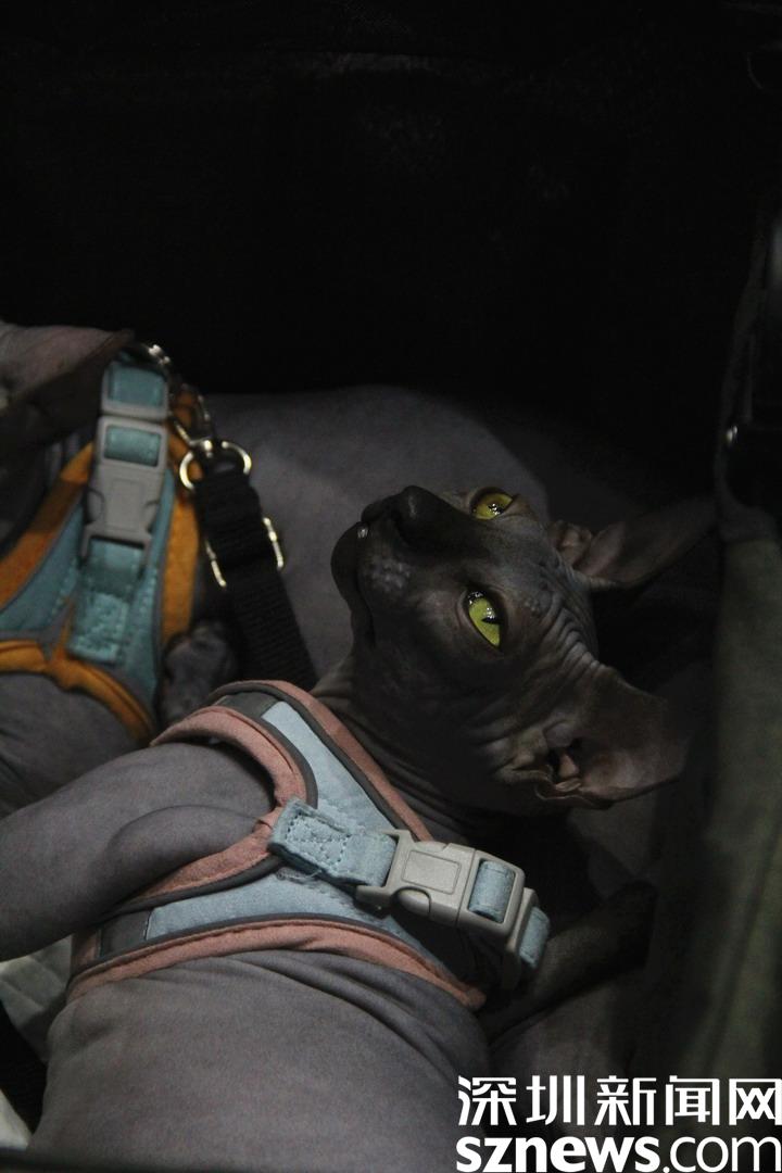 黏人的无毛猫与主人一同逛展。