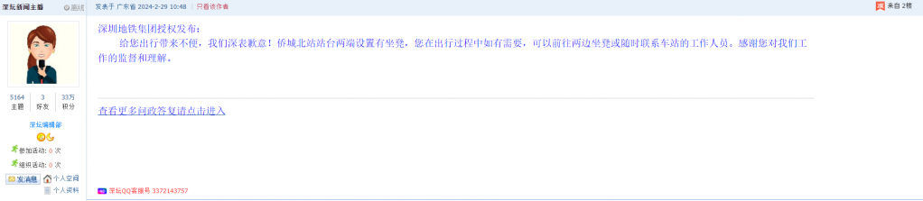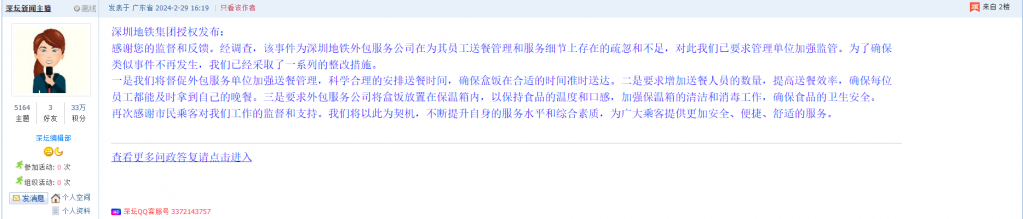 据统计,2024年2月26日-3月3日,网友在深圳论坛发布问政类帖文共33篇,得到相关单位正式回应的帖文数为16篇,回应最快的部门是深圳地铁集团。