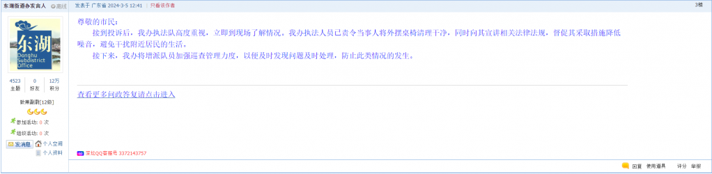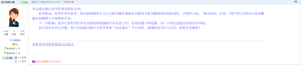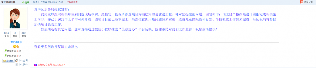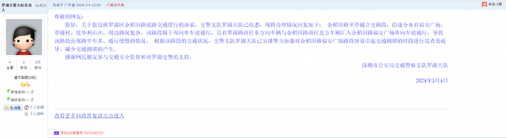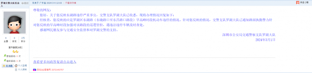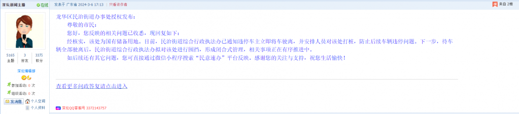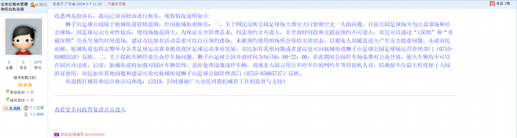 各职能单位如需对网友反映的问题进行回应,可在深圳论坛注册官方账号并通过认证,回帖进行回应。