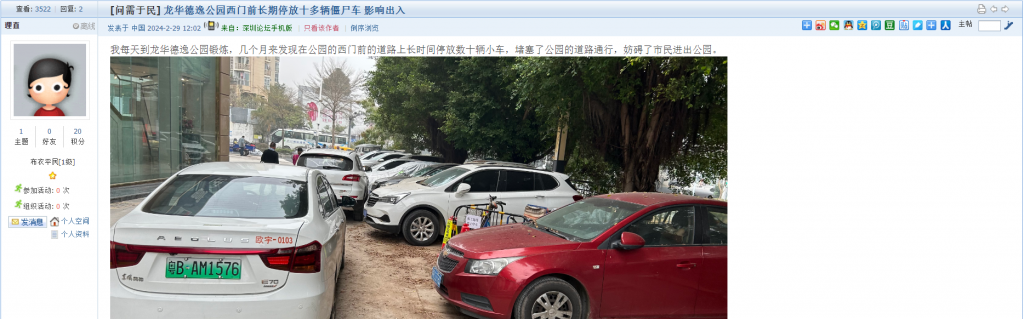 9、帖文《龙华德逸公园西门前长期停放十多辆僵尸车 影响出入》